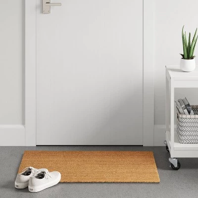 This Solid Doormat from Room Essentials⢠is perfect for welcoming guests to your doorstep through all four seasons. This outdoor doormat’s coir construction helps clear dirt and debris from shoes, while the vinyl backing prevents it from sliding. In addition to protecting your porch or doorstep from wear and tear, it also helps keep dirt and mud from tracking into your home. Best of all, this doormat is super-easy to maintain ā just shake it clear of debris for easy cleaning.