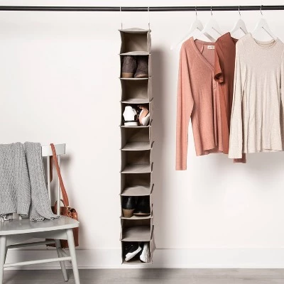 Store your bags, shoes and other small accessories in the 10-Shelf Hanging Shoe Storage Organizer from Room Essentials™. Featuring a fabric construction in a gray mist color that blends with any decor, this shoe organizer makes a functional addition to your home. Plus, this free-standing organizer comes with convenient hooks for easy hanging while keeping your space free of clutter.
