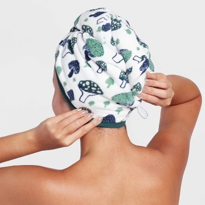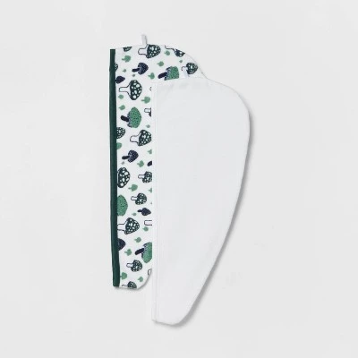 Help keep your hair dry with this 2-Pack of Mushroom-Print Hair Wraps from Room Essentials™. Made from a soft, year-round fabric, these printed hair wraps feel soft against your head and help keep your hair in place while drying. Plus, they’re designed with a small elastic loop at the back for conveniently wrapping your hair. This pack includes two hair wraps — one in solid white and one with allover mushroom prints in green on a white background — to add sweet style to your bathing and grooming routine.