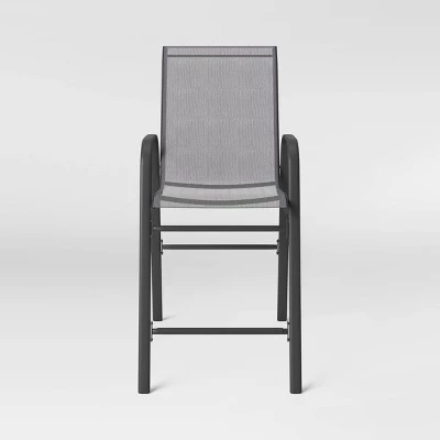 From enjoying your favorite drink to spending time with friends, bring comfort and style to your outdoor seating space with this 2-Pack Bar Chairs from Room Essentials™. This patio bar chair set includes two sling bar chairs boasting a rust- and weather-resistant construction that helps keep them protected from the elements. Supported on a metal frame with a sling back and seat in a solid hue, these patio bar chairs feature armrests for comfy sitting, while a footrest provides a comfortable place to set your feet.