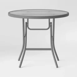 Enjoy evening tea or just chat with your friends or family in your outdoor space on this Patio Bistro Table from Room Essentials™. Featuring metal construction in a gray finish, this bistro table is weather-resistant to withstand the outdoor elements. The round table stands atop four foldable legs and has a spacious glass tabletop for resting beverages, serving mouthwatering snacks and displaying magazines while you relax after a long day or while entertaining guests. Plus, its convenient foldable design lets you fold it away for easy storage. Complete the look with any style of chairs and enjoy entertaining family and friends for years to come.