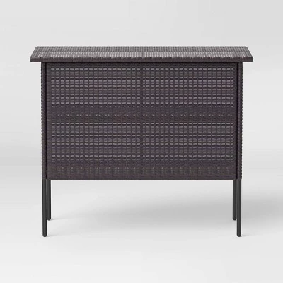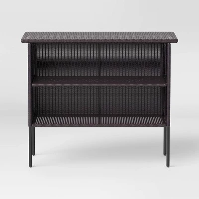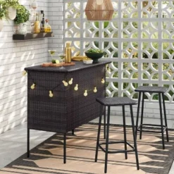 Host friends and family in style with this 3-Piece Wicker Store & Serve Bar Set on your deck or patio. This three-piece outdoor bar setup includes a wicker bar and two matching stools, each made up of a steel frame with dark brown woven wicker making up the bar sides and top and stool seats. The rust-resistant, all-weather design is suitable for outdoor use, and the backside of the bar features two open shelves for convenient storage space.