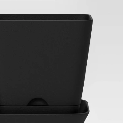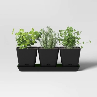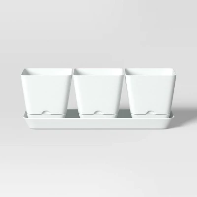 Show off your greenery in style with this Outdoor Square Trio of Planters with Tray from Room Essentials™. This trio of square planters within a matching tray makes a stylish piece for tabletop or floor placement. Each planter features a modern square shape in a solid finish for chic flair. These stylish planters are contained in an included tray to keep your space mess-free, making them perfect for housing a variety of leafy greens, botanicals and faux plants. Simply place the set on your porch, terrace or balcony area for a refreshing vibe.