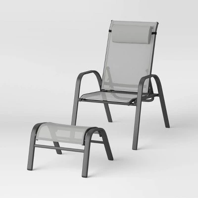 Create memories enjoying conversation with a loved one using this Five-Piece Adjustable Back Patio Chat Set from Room Essentialsâ„¢. This five-piece patio chat set includes two adjustable-back chairs, two ottomans and one table to help create a complete relaxation spot. The chairs with arms feature a headrest to help provide complete support while the ottomans provide the perfect spot to rest your feet. Designed in gray, this patio furniture set goes well with a range of home decor styles and palettes, and withstands outdoor elements with their weather- and rust-resistant design.