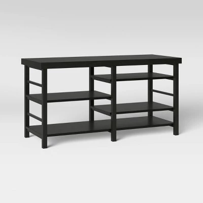 Organize your entertainment space or media room with the Adjustable Storage Media Stand from Room Essentials™. Standing atop a metal frame for durability and lasting use, this media console features adjustable shelves that give you flexible and customized options to store and display your media, electronics or books with ease, while the sturdy tabletop provides a base for placing framed photographs, succulents or other decorative items. Showcasing a matte black finish with an open design and sleek lines, this decorative media stand fills your space with contemporary and modern flair.