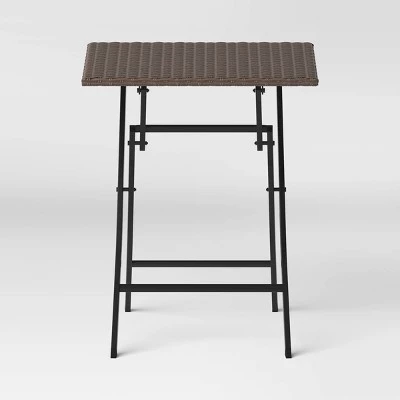 The Wicker Square Folding Outdoor Portable Side Table from Room Essentials™ makes a versatile addition to your outdoor furniture. The patio side table showcases a square tabletop with woven wicker detailing for an attractive look that upgrades your space with modern style. The metal-frame table boasts rust-resistant and all-weather qualities to stand up to the elements, while the foldable design makes it easy to store away between uses or over the winter.