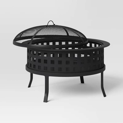 Add cozy warmth to your outdoor space season after season with this Metal Lattice Wood Burning Round Outdoor Fire Pit from Room Essentials™. Made from rust-resistant steel to look great year-round, this round fire pit features mesh sides with a decorative lattice overlay and is founded atop angled legs for a modern touch. Plus, it includes a spark screening lid to prevent embers from flying out. Start roasting marshmallows, hot dogs or enjoy chit-chat with friends or family with this round fire pit.