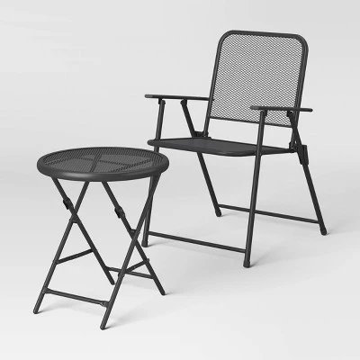 Give your patio or backyard a modern look from the Metal Mesh Folding Patio Bistro Collection from Room Essentials™. The steel chairs and table are perfect for accessorizing with cushions of your choosing to add personal style. A rust-resistant design lets you use them over and over again through all kinds of weather, making them ideal for hosting social events. The legs can be folded to make for compact storage to keep your patio space tidy.