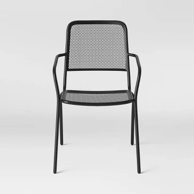 Revamp your open-air seating nook with the Metal Mesh Patio Stack Chair from Room Essentialsā¢. This sling patio chair is made from rust-resistant materials, making it just the right pick for your deck, backyard or patio. Supported on a metal frame with a mesh back and seat in a solid hue for an airy feel, this patio chair is designed with armrests for comfy sitting, while the stackable design allows for space-efficient storage between uses and seasons.