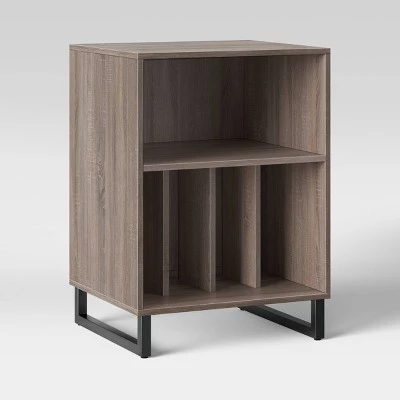 Update your TV room or entertainment area in chic, contemporary style with the Mixed Material Record Listening Station from Room Essentials™. Featuring a sleek build with a laminated design and a geometric base for a contemporary look, this gray record listening station is perfectly sized to securely place your record player inside while the record dividers below offer plenty of space to keep your albums or DVDs organized. Crafted from a solid wooden frame, this wooden media storage cabinet can also be used as a bookshelf or simply to organize your audio equipment and DVDs. Two people recommended for assembly. Assembly time is approximately 1-2 hours.