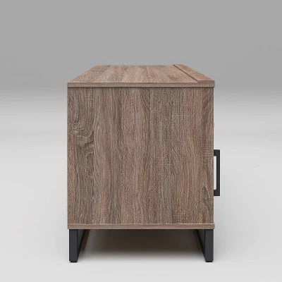 A perfect combination of fashion and function, this Mixed Material TV Stand from Room Essentials™ makes the ultimate focal point for your living room layout. Crafted from sturdy material for lasting use, this TV cabinet showcases a clean-lined silhouette in gray finish for an understated modern appearance that’s perfect for just about any home. A pair of open shelves gives you space to display DVD players and often-watched DVDs, while a large drawer lends even more space to stash your collection of entertainment accessories. Plus, the cable cutouts in the back help you keep your space clutter-free. Display your television set in style with this media cabinet. Designed to fit TVs up to 60 pounds or 54 inches. TV should be placed behind the raised ledge. Two people recommended for assembly. Assembly time is approximately 1-2 hours.