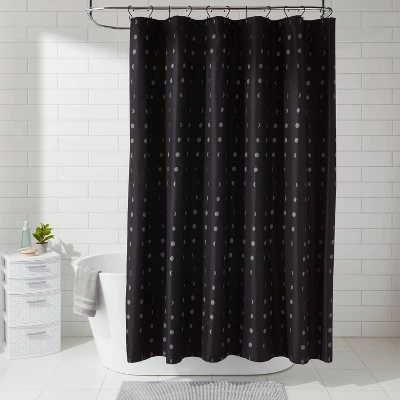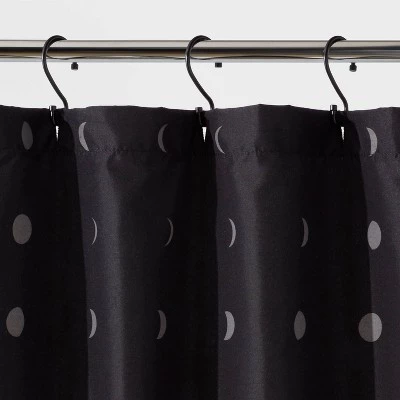 Add an extra dimension of comfort and style to your showering experience with this Microfiber Moon Shower Curtain from Room Essentials™. Showcasing a unique moon print in a soothing palette of white on a black background, this printed shower curtain instantly refreshes your bathroom space and blends effortlessly with a variety of decor styles. Complete with a sturdy buttonhole top for easy and reliable hanging, this sturdy shower curtain helps protect your bathroom floor and keeps the water in the shower. Simply pair it with coordinating bath rugs and matching accent pieces to bring a cohesive vibe to your bath space.