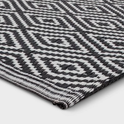 Add a stylish geometric pattern to your indoor or outdoor space with the Reversible Diamond Patio Mat from Room Essentials™. This rectangular area rug is decked out in an intricate and seamless diamond pattern in black and white that will easily coordinate with your existing decor. This geo-pattern rug is made of a material that’s suitable for use indoors or out, and it helps to add a chic pattern to your decor that will tie together your seating while adding a welcoming feel. Plus, the reversible construction means this rug provides extra versatility you’ll love.