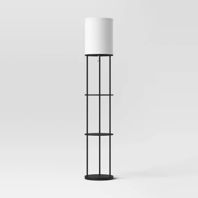 Make an eye-catching addition to your home while lighting up the space with the Shelf Floor Lamp from Room Essentials™. Crafted from metal in a sleek black finish for polished appeal, this decorative floor lamp stands on a round base and features a pair of shelves that can be used to display photographs and other decorative accents. This freestanding lamp is topped off by a white cylindrical fabric shade to brighten up your space with a soft glow. Easy to operate with a pull-chain switch and one-way light setting, this modern lamp perfectly suits both your lighting and storage needs, while the long cord gives you the freedom to choose where you want to place it.