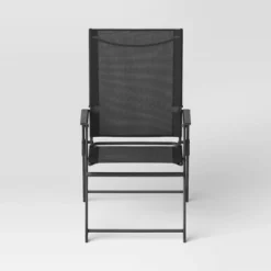 Update your home decor with the Sling Folding Chair from Room Essentials™. This black chair features a mesh design with a metal frame for a sleek look you’ll love accenting your home with. With a cool weather-resistant design, this sling chair comes with armrests for comfortable sitting, and can be folded for convenient storage.