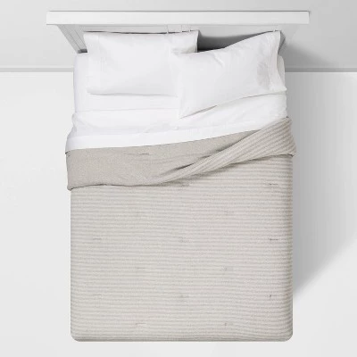 Elevate your bedroom decor with the Reversible Microfiber Striped Comforter from Room Essentials™. Boasting a soft microfiber construction for complete comfort in bed, this quilted bed topper features tufted detailing for an extra touch of coziness and texture. This quilted comforter features a classic light pink striped pattern on the front and it can be flipped to a solid blush jersey design on the reverse for a neutral touch. Simply add contrasting sheets, colorful shams and comfy pillows to infuse life into your master suite or guest bedroom.