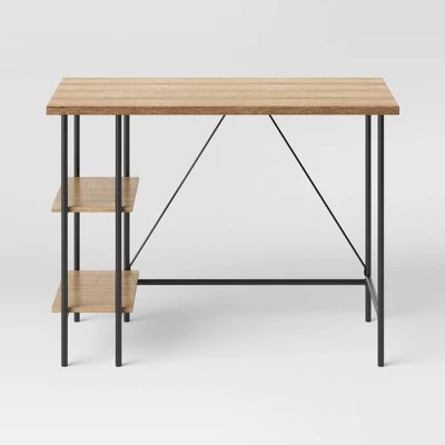 Give a modern, industrial touch to your home office with the Mixed-Material Desk with Shelves from Room Essentials™. Standing at a height of 30 inches, this desk boasts a metal frame in a black finish for polished style, which is contrasted by a light brown wood-finish tabletop and open shelves. The smooth rectangular tabletop provides a convenient spot for your laptop, along with some additional display area. There are lower open shelves on the right side to offer you ample storage and display space, and there is enough space on the left side to offer you legroom to sit and stretch comfortably. The tubular black metal frame has an open, airy design with an inverted V pattern at the back for enhanced visual interest that also helps keep cords and cables neatly organized and accessible.